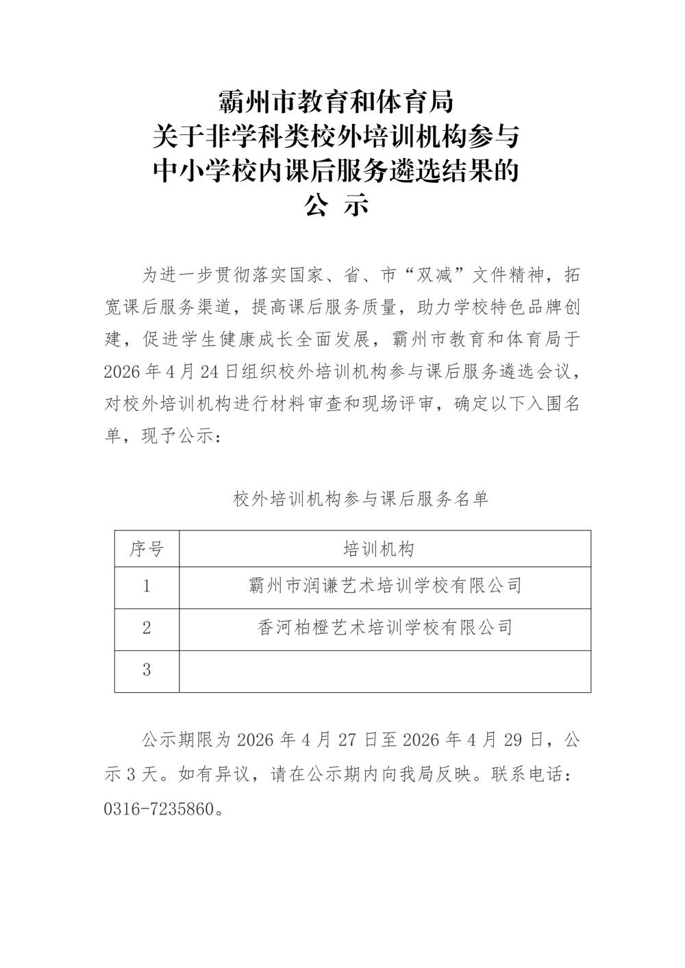 霸州市教育和体育局关于非学科类校外培训机构参与中小学校内课后服务遴选结果的公示