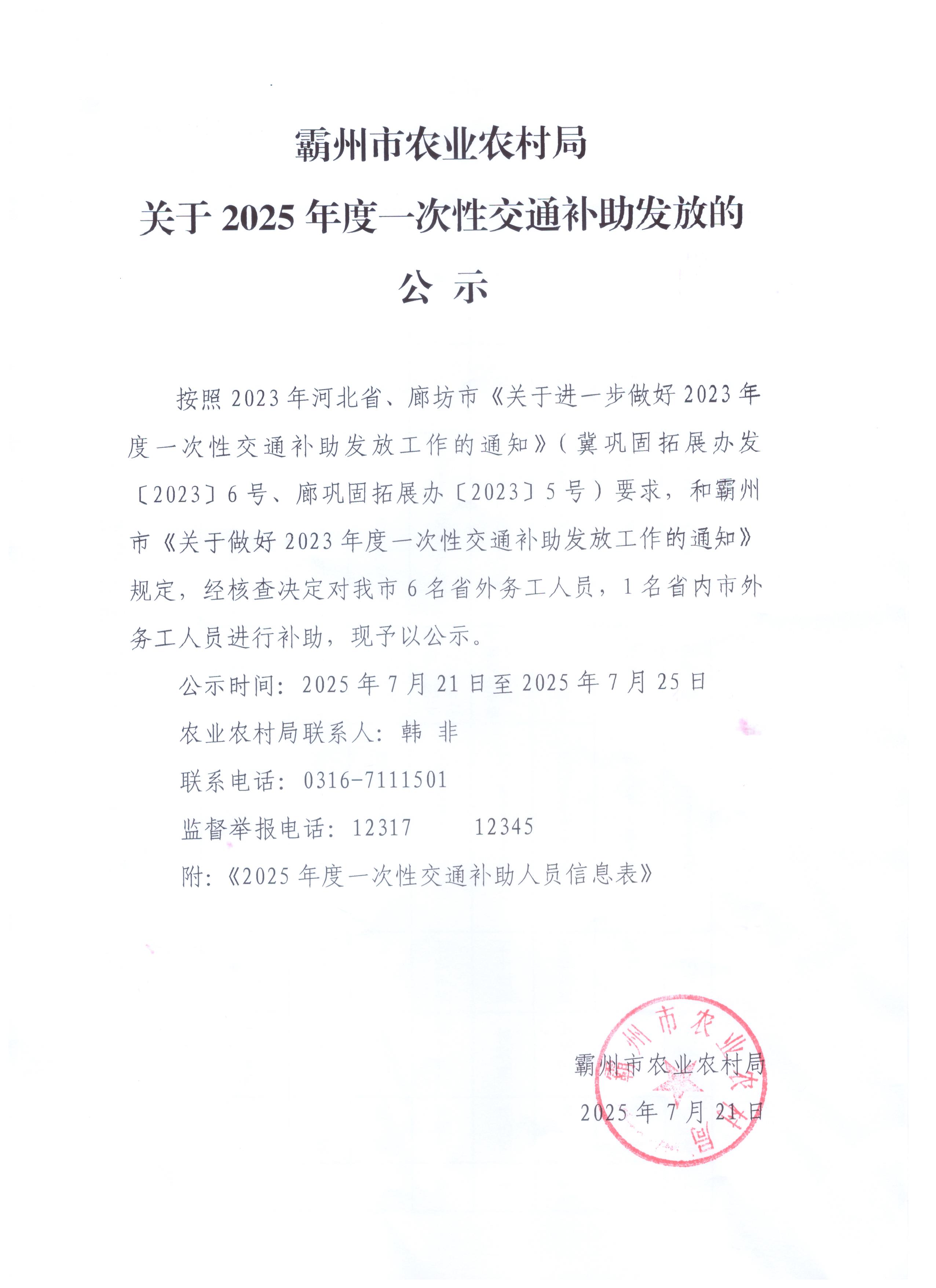 霸州市农业农村局关于2025年度一次性交通补助发放的公示 | ||||