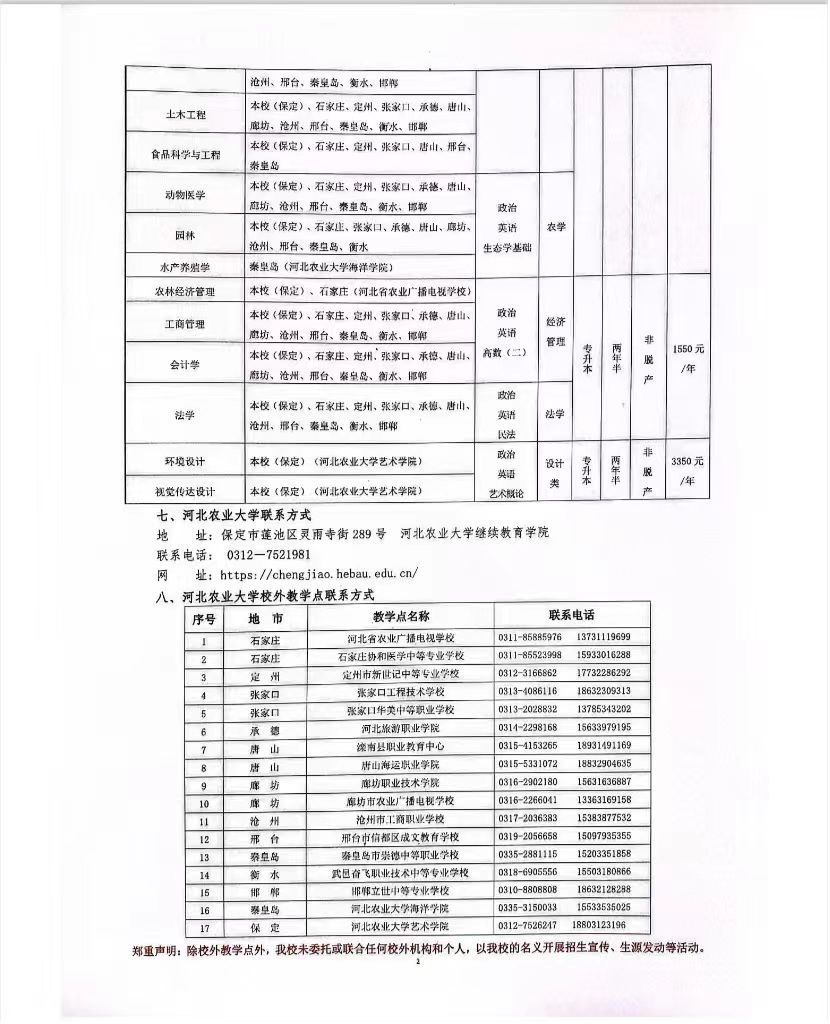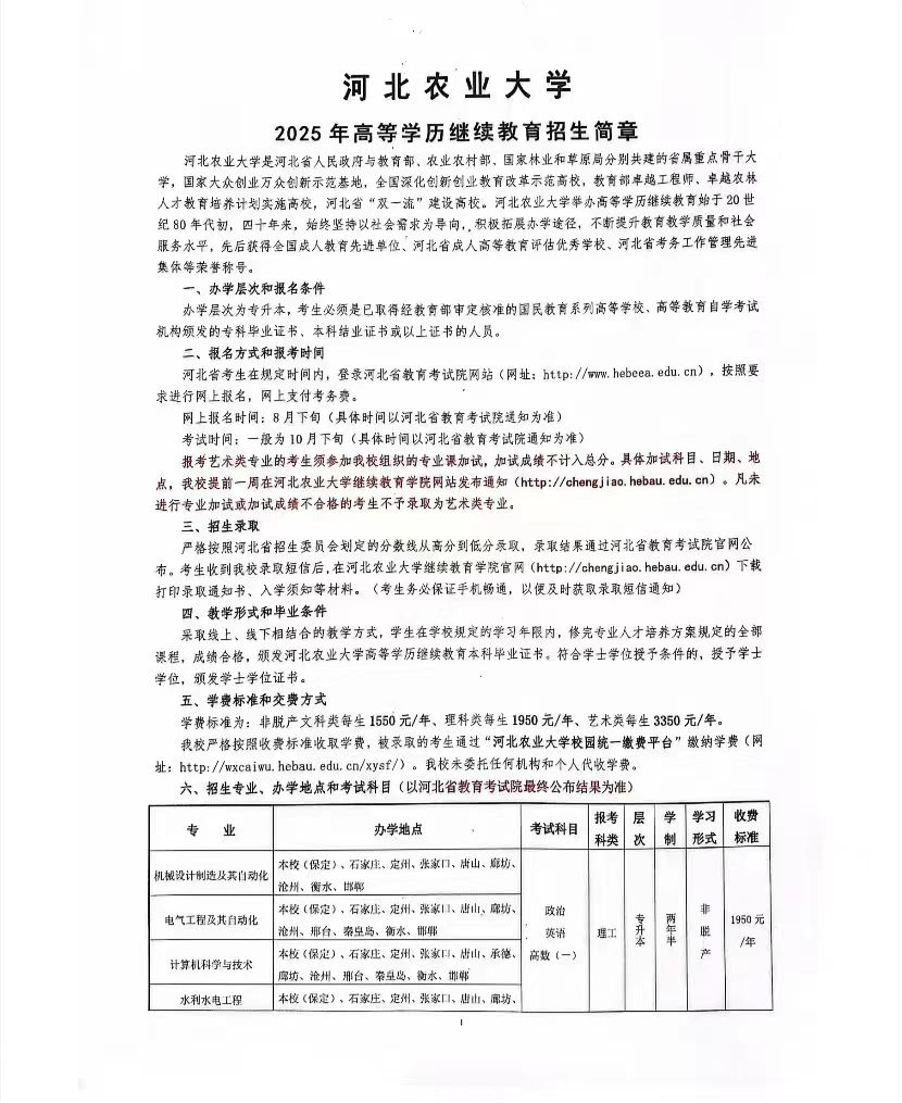 为积极落实廊坊市农广校2025年成人学历教育指导精神,扎实推进本市农广校在全市农业农村群体中开展成人学历教育的深度和广度,为我市农业产业发展的人才群体,提供科学有效的知识导引和储备,进一步夯实我市农村产业行业发展的基础,特公开发布关于转发《廊坊市农业广播电视学校2025年成人学历教育招生简章公布》的公告,希望全市参与农业产业发展和乡村振兴建设及亟需产业行业指导的群体积极报名参与。 霸州市农业农村局农广校 2025月7月25日 廊坊市农业广播电视学校2025年成人学历教育 招生简章公布 一、学校简介 廊坊市农业广播电视学校为省属成人中等职业学校,隶属于廊坊市农业农村局,属公益一类事业单位。学校严格按照有关法律和规定办学,法人证书、机构代码证书、合作协议、河北省教育厅年检结果等相关证件手续齐全。现有市县两级农业广播电视学校共9所:市级校1所、县(市)分校7所(三河市、大厂县、永清县、固安县、霸州市、文安县、大城县)、香河县农广校已合并至香河县农业农村局农业科技教育中心。 我校拥有面积为400平方米独立教学办公区,建有多媒体教室1个,配备教学电脑、投影设备、音响设备及相应教学用具,可容纳60人;教学机房1个,可容纳50人;办公室8间,办公用计算机20台。 我校坐落在享有“京津走廊上的明珠”和“连京津之廊、环渤海之坊”美誉的廊坊市主城区,地处京津冀协同发展重要节点,同时与北京城区、天津城区和雄安新区接壤,位于北京、天津、雄安新区黄金大三角核心腹地,毗邻京津都市农业圈,京津冀涉农产业深度融合发展,得天独厚的地理位置和京津冀协同发展的绝佳机遇为学校教学与实践提供丰富资源。 我校自1989年建校以来,始终专注于农业教育,为“三农”事业输送大量实用型人才,助力学员实现农业梦、致富梦和乡村振兴梦,历经36年发展,在区域农业教育中占据核心地位。 2025年,我校继续面向社会进行河北农业大学函授专升本招生,及河北省农业广播电视学校中等职业教育招生。具体开设专业、学费标准、报名方式等信息,详见以下招生简章。 二、农业大学本科招生简章 (一)办学层次和报名条件 办学层次为专升本,考生需取得经教育部审定核准的国民教育系列高等学校、高等教育自学考试机构颁发的专科毕业证书、本科结业证书或以上证书的人员。 (二)招生专业 开设动物医学、机械设计及其自动化、计算机科学与技术、电气工程及其自动化、水利水电工程、土木工程、工商管理、会计学等热门专业,涵盖多个契合农业农村发展需求的领域,无论是怀揣农业创业梦想的新农人,还是期望拓展职业发展路径的职场人士,亦或是渴望提升专业技能的行业从业者,都能找到与自身兴趣和职业规划相匹配的专业方向。 (三)报名方式、报考时间 河北省考生在规定时间内,登录河北省教育考试院网站(网址:http://www.hebeea.edu.cn),按照要求进行网上报名,网上支付考务费。 网上报名时间:8月下旬(具体时间以河北省教育考试院通知为准) 考试时间:一般为10月下旬(具体时间以河北省教育考试院通知为准) (四)学制及学费缴纳 学制:2.5年 学费标准为:函授文科类每生1550元/年、理科类每生1950元/年。 (我校严格按照收费标准收取学费,被录取的考生通过“河北农业大学缴费平台”缴纳学费(网址:https://www.hebau.edu.cn/info/1063/2905.htm),未委托任何机构和个人代收学费。) (五)报名联系方式 办学地点:廊坊市广阳区金光道43号601室 联系电话:0316-2266041 13315631151 (六)招生简章及视频 ![]() ![]() 三、中等职业教育招生简章 (一)招生条件 凡具有初中及以上文化程度(或具有同等学力)均可报名。 (二)招生专业 工商行政管理事务、园艺技术、植物保护、畜禽生产技术、作物生产技术、直播电商服务、休闲农业生产与经营、农村经济综合管理、设施农业生产技术、社区公共事务管理 (三)招生时间 春季截止到3月15日;秋季截止到10月15日。 (四)提供资料 报名时需提交身份证复印件1份、小二寸蓝底照片3张及电子版照片一份,填写新生报名表1份。 (五)学制及学费 学制2年,学费每年500元,共计1000元。 (六)报名联系方式 办学地点:廊坊市广阳区金光道43号604室 联系电话:0316-2266043 17716553098 (七)本市农广校招生服务热线 联系人:王健18832608669 联系电话:0316-7111593 市农广校邮箱:bzngx@163.com