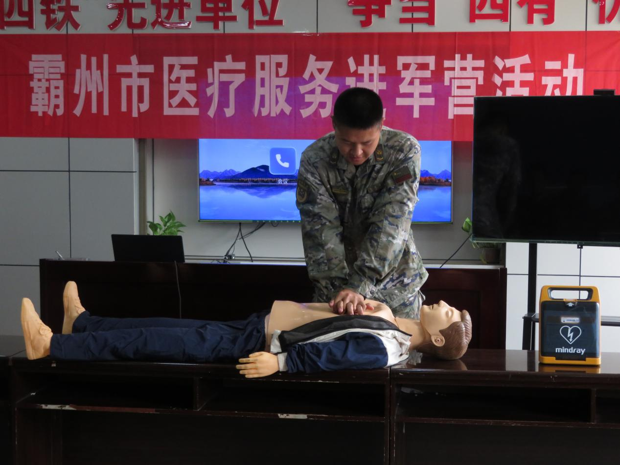 活动现场,急诊科医生首先对官兵们开展急救知识培训,分别就什么情况下需要做心肺复苏、胸外按压的操作要领等内容进行详细讲解,并利用模拟人进行心肺复苏的示范操作。
