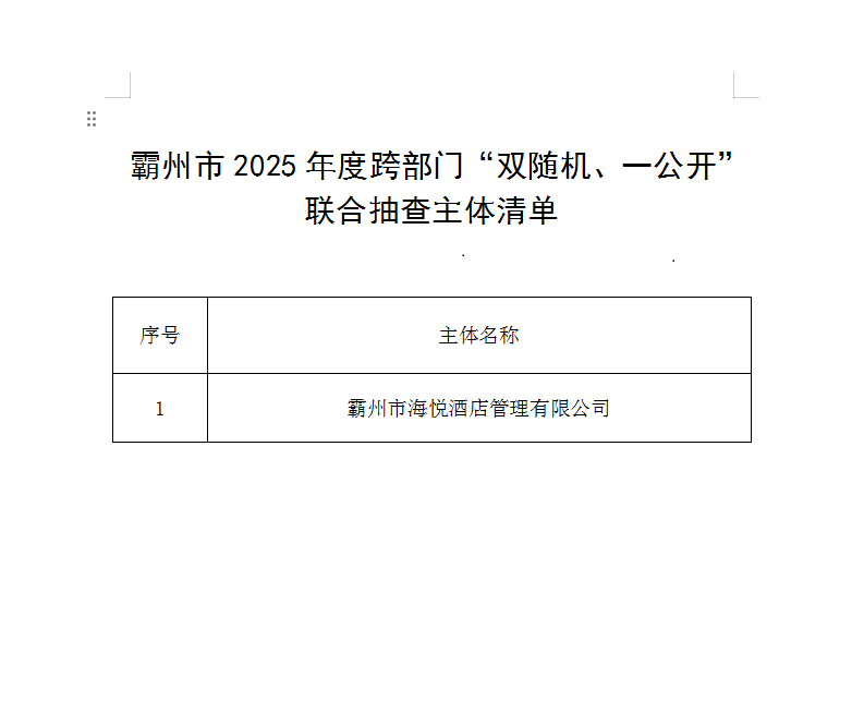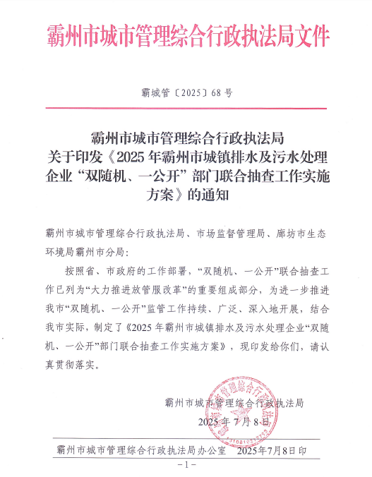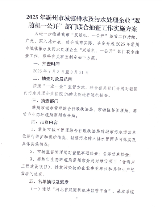 关于印发《2025年霸州市城镇排水及污水处理企业“双随机、一公开”部门联合抽查工作实施方案》的通知