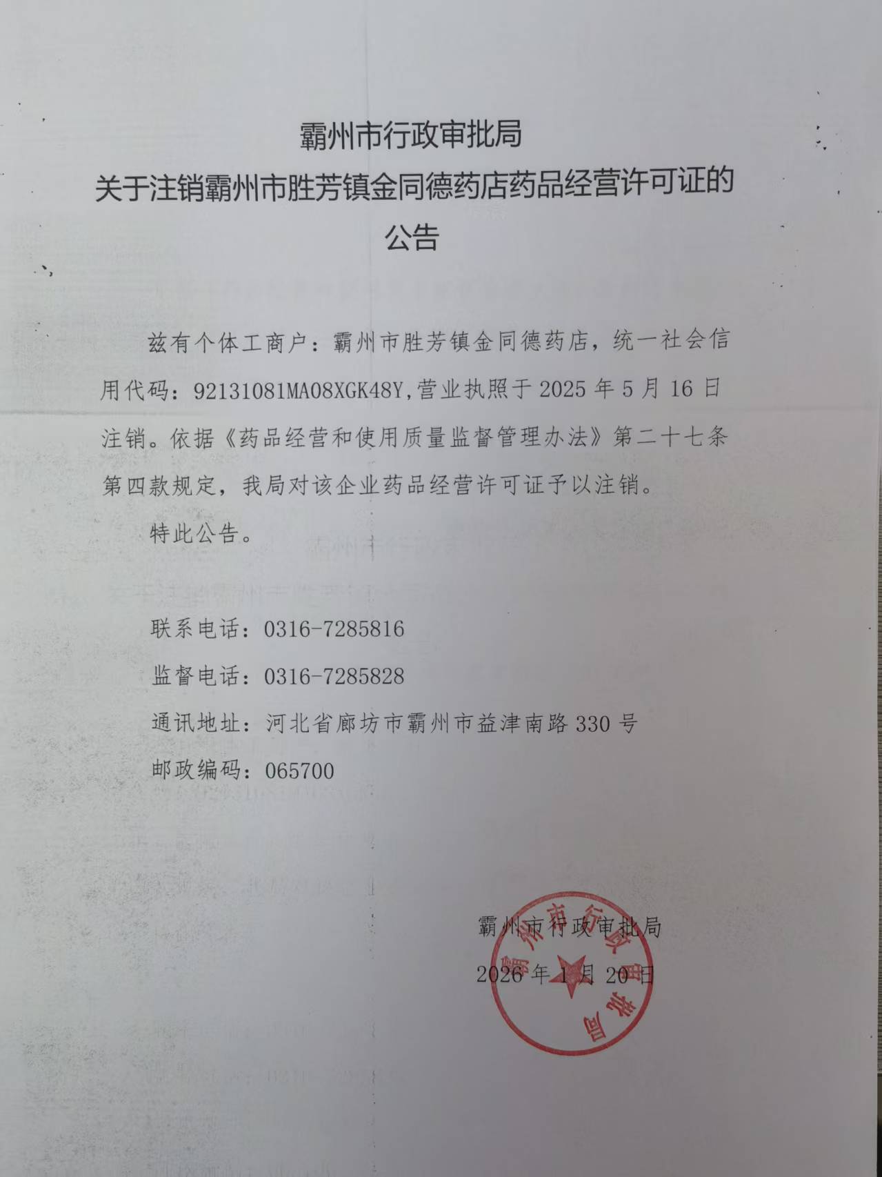 关于注销《霸州市胜芳镇金同德药店药品经营许可证》的公示
