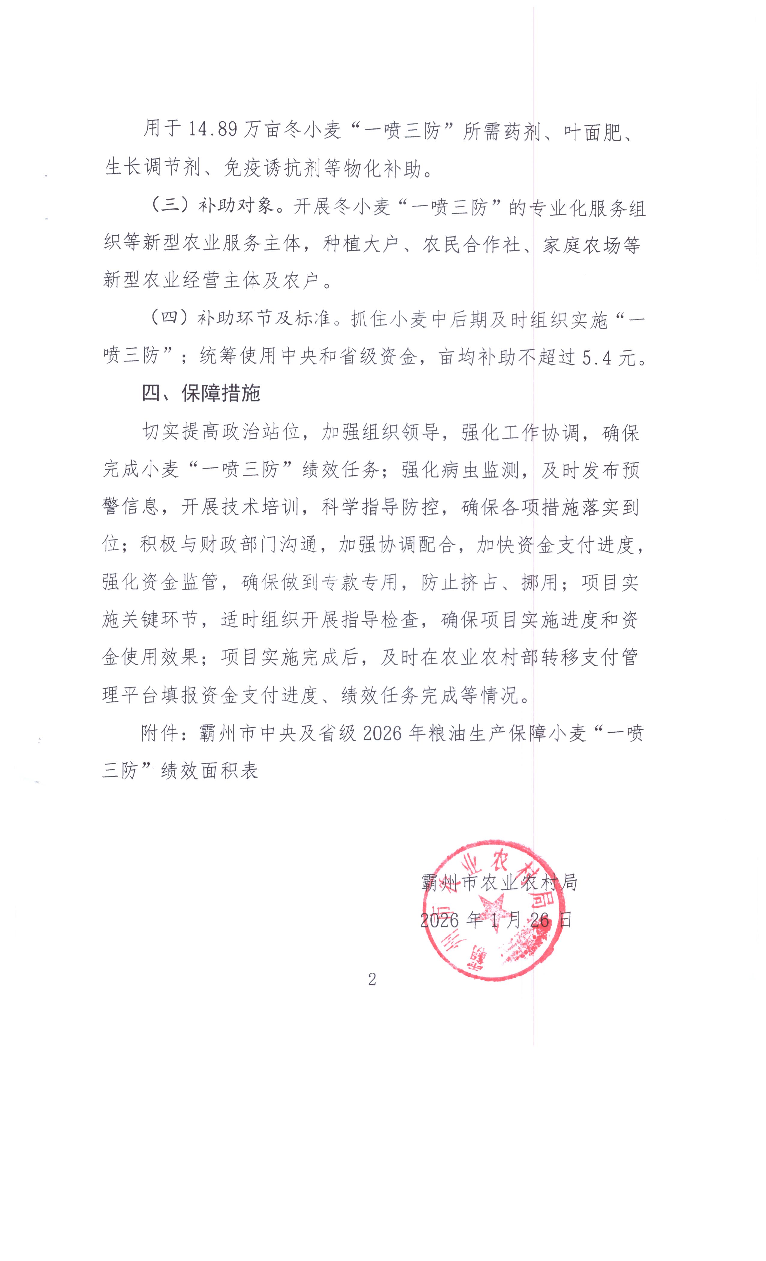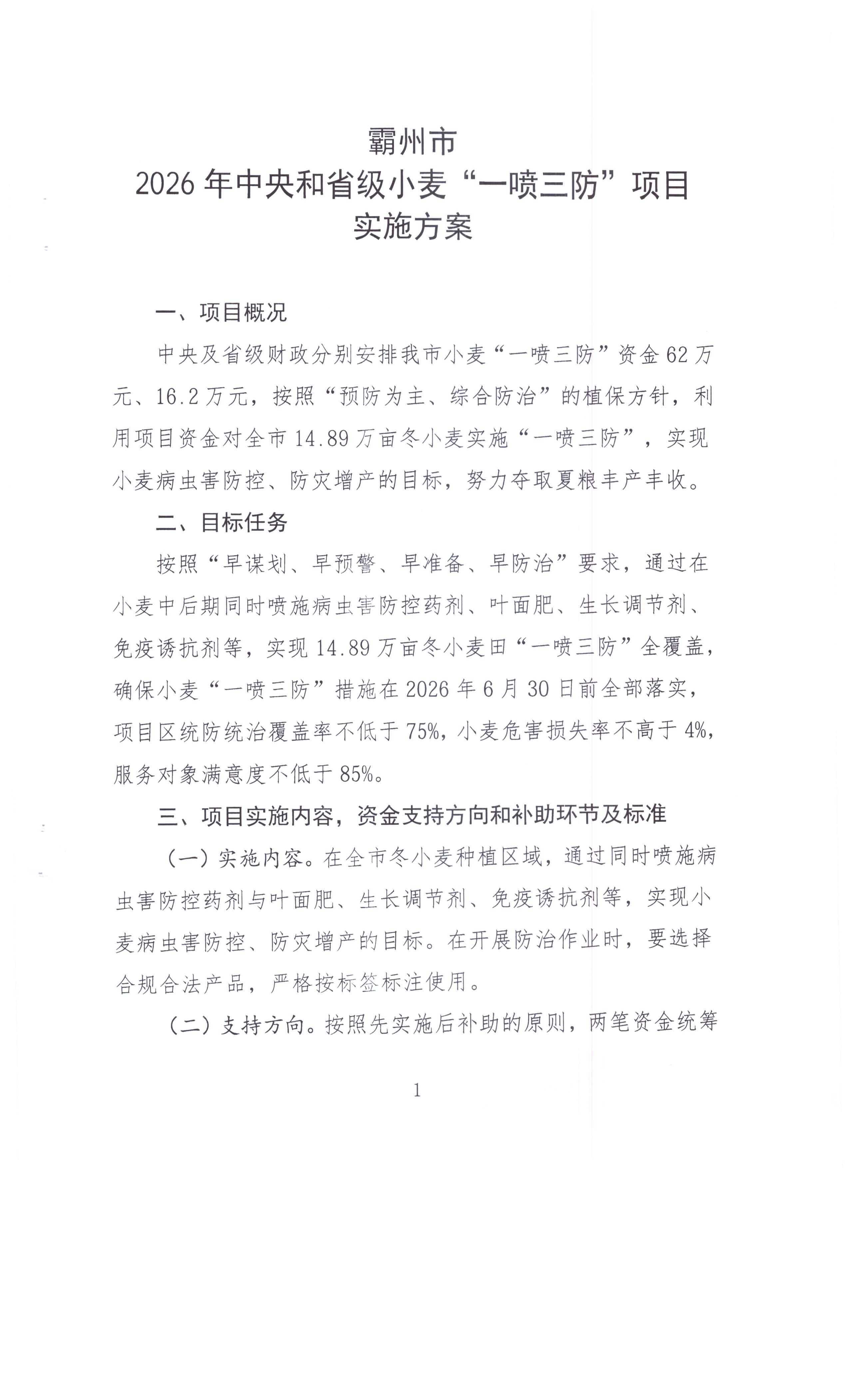 霸州市2026年中央和省级小麦“一喷三防”项目实施方案