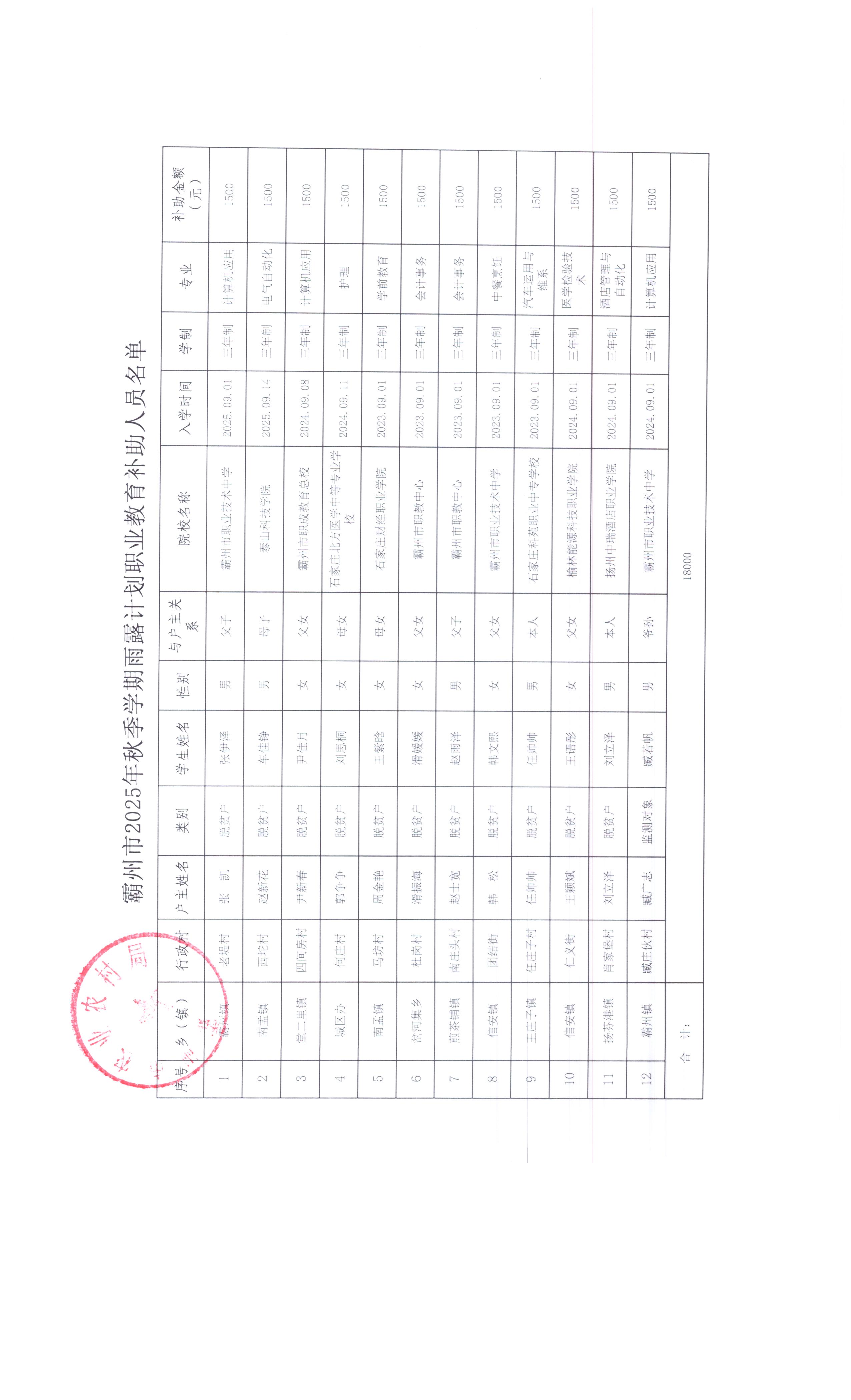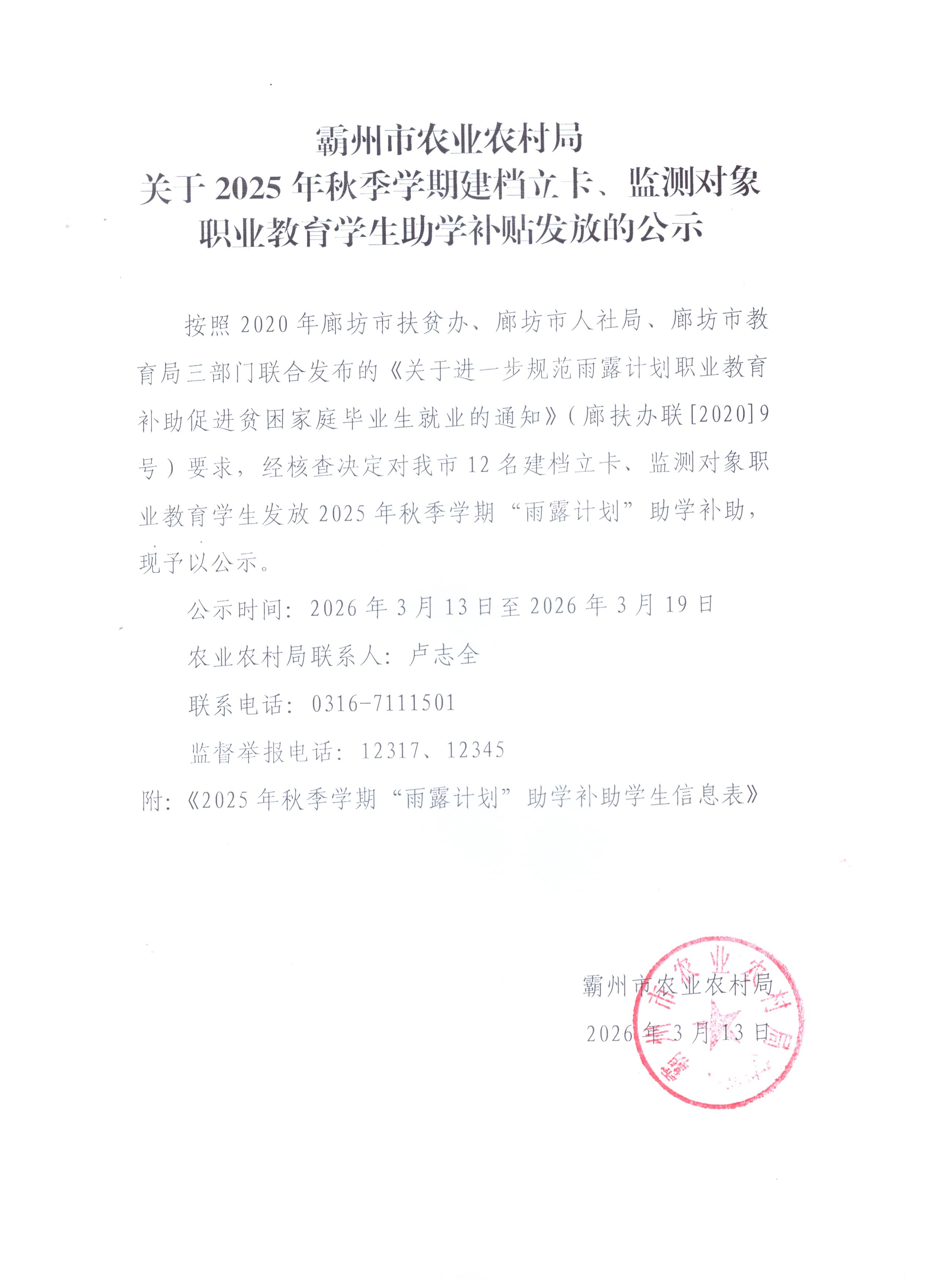 霸州市农业农村局关于2025年秋季学期建档立卡、监测对象职业教育学生助学补贴发放的公示